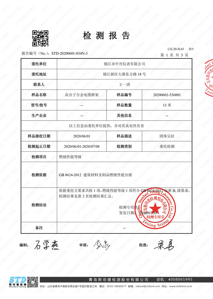 資質(zhì)證書 Qualification certificate高分子合金電纜橋架檢測報(bào)告 STD-20200601-034N-3