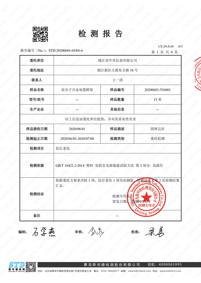資質(zhì)證書 Qualification certificate高分子合金電纜橋架檢測報告 STD-20200601-034N-4