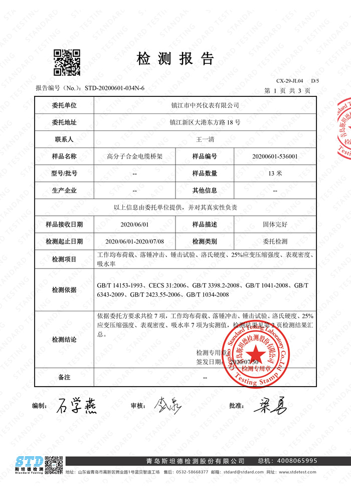 資質(zhì)證書 Qualification certificate高分子合金電纜橋架檢測報告 STD-20200601-034N-6